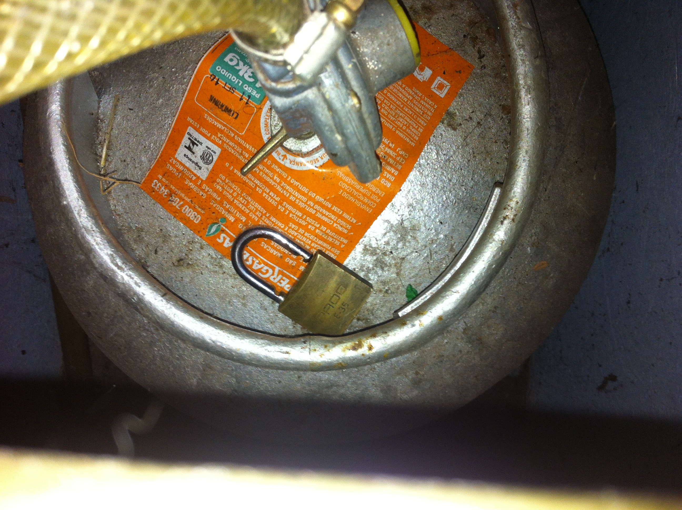 Foto do cadeado da porta de entrada arrombado e ocultado na caixa de abrigo do botijão de gás - 01